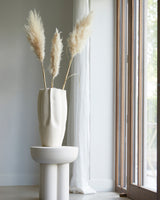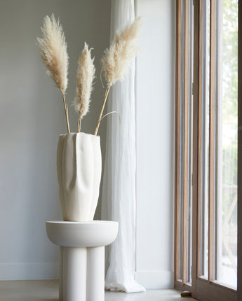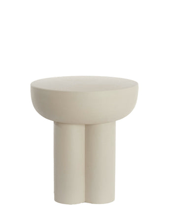 The Mikola side table with a matte cream surface and elegant, minimalist design brings a timeless and calm expression to the room. The round table has a domed metal tabletop that is balanced by three slender columns.