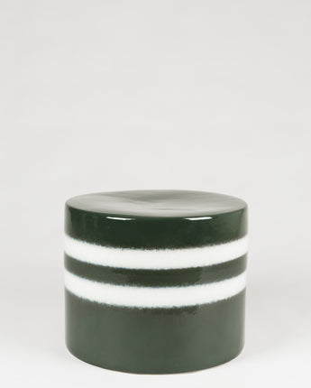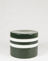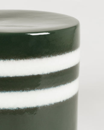 An elegant round side table with a dark green surface and white horizontal stripes - made of elegant ceramic and with a glossy finish that will be a stylish accent in the room. Mooca has an artistic character and is equally suitable as a side table by the sofa, as a plant stand or as a decorative surface.