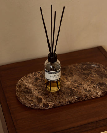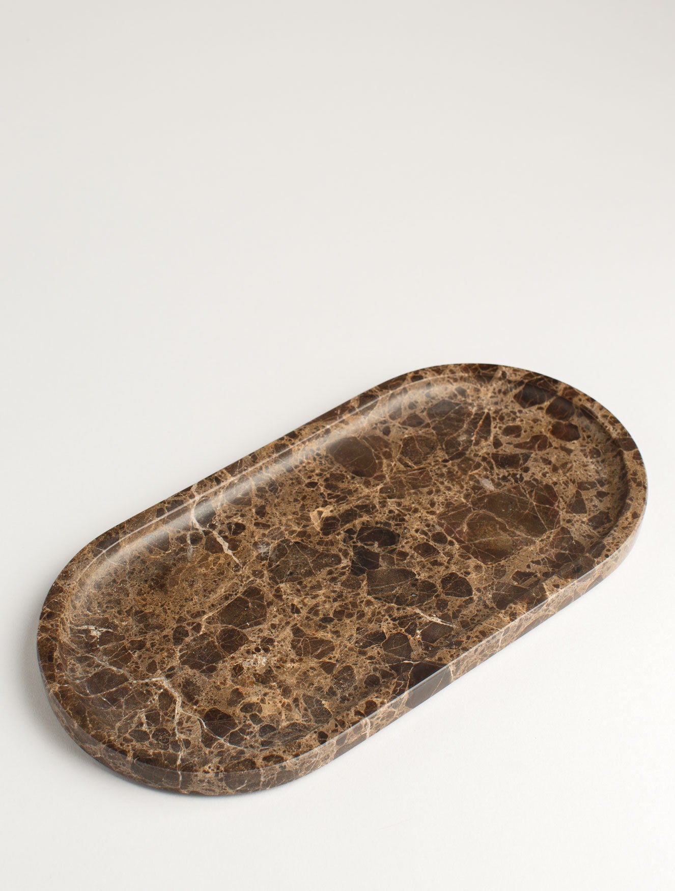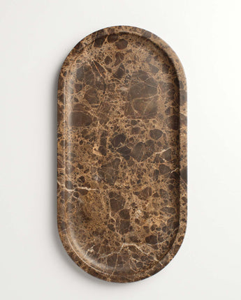 Experience elegance with our Marble Tray Brown Oval 30x15cm . Made from high-quality marble, this tray is not only a stylistic addition to any room, but also a durable and versatile serving solution. Its sleek design and sturdy construction make it perfect for both everyday use and special occasions. Whether you're hosting a dinner party or simply need a sophisticated way to serve appetizers, this marble tray is a must-have for any homeowner.