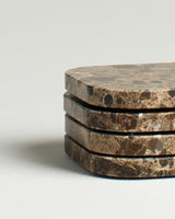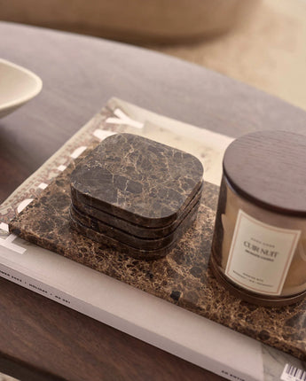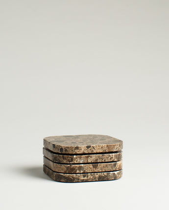 Experience the elegant touch with our Brown Marble Coasters 4-pack. These coasters, cast in brown marble, add a touch of sophistication to your home. They are perfect for protecting your furniture from glass splatters and leaving a sleek, polished finish. Each coaster measures 10x10x1cm, making them large enough to protect your surfaces but small enough to be discreet. They are also easy to clean, so you can keep your home decor looking nice and fresh.