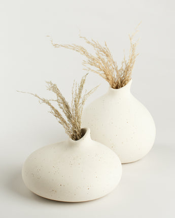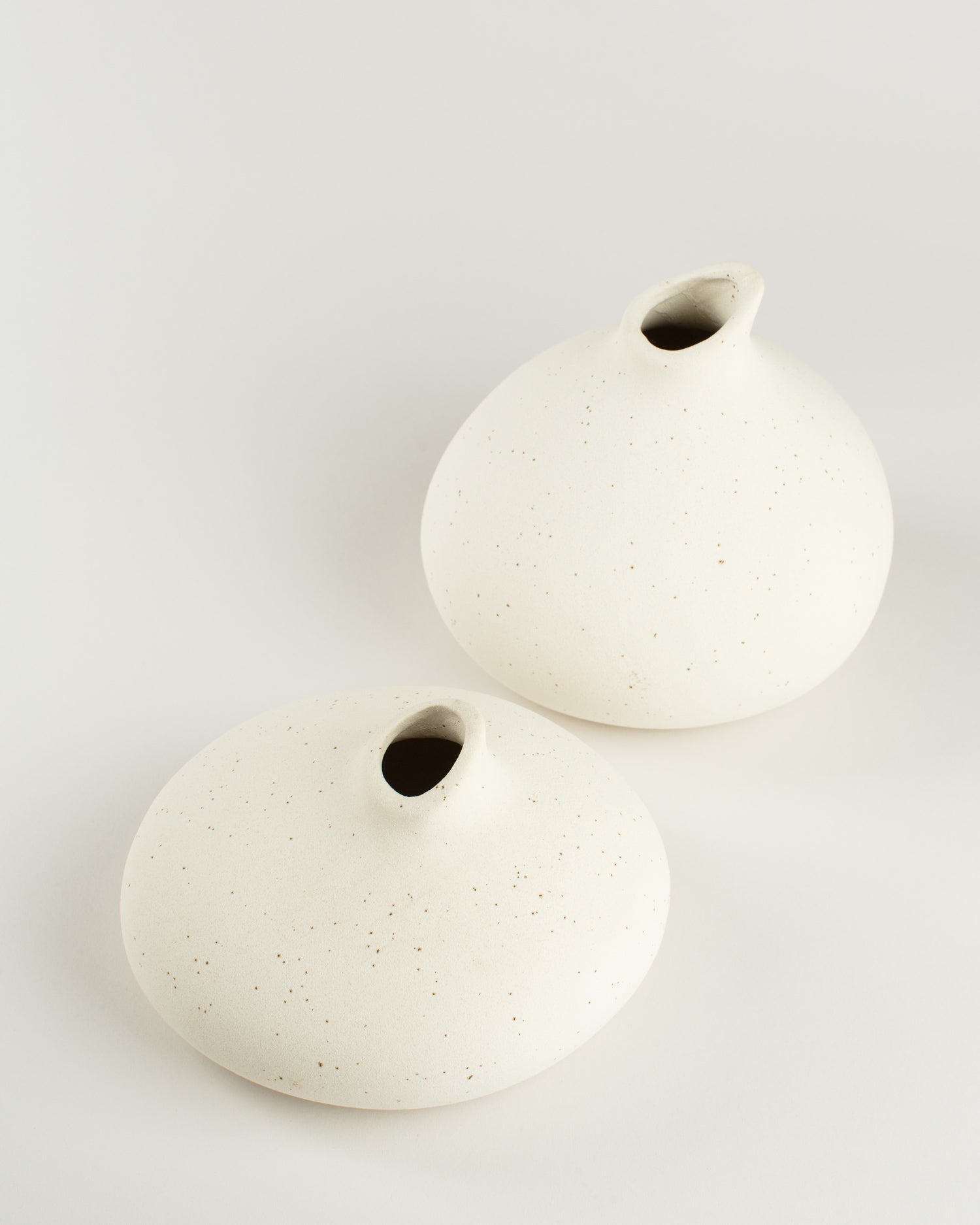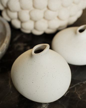 En liten med uttrycksfull vas som kombinerar modern form med mjuk elegans. Den handgjorda känslan och den ljusa cremetonen gör den lätt att placera i många rum.